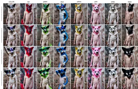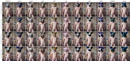 LoRAは、タグに「[種類] AND/OR [毛色/鱗色] furryzsuithead mask」と接頭辞を付けると、例画像に見られるように非常にうまく機能します。ただし、種類が非常にマニアックだったり、顔構造が「標準的」でないほど、準拠度は低下します(特に長い吻を持つ種類が最もよく機能します)。