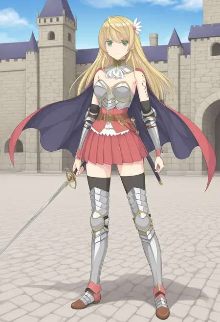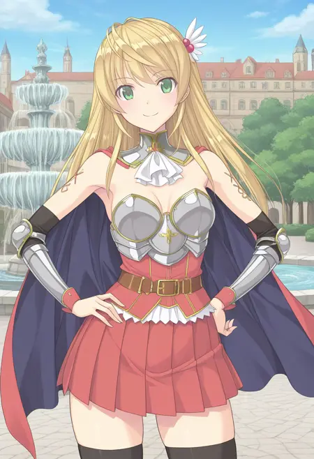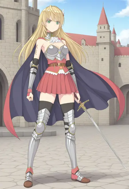 关键词:lunassl12,金发,长发,发饰,绿眼,斗篷,护喉,领结,手臂纹身,无肩带上衣,盔甲,胸甲,腰带,护臂,褶裙,过膝袜,盔甲靴