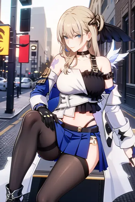 多色头发,长发,白色蓝色夹克,黑色连裤袜,蓝色裙子,耳环,首饰,蓝色眼睛,十字耳环,无袖设计,裙子,肚脐,过膝袜,颈圈,挑染头发,裸露肩膀,渐变头发,纹身,露脐装,黑色无指手套,