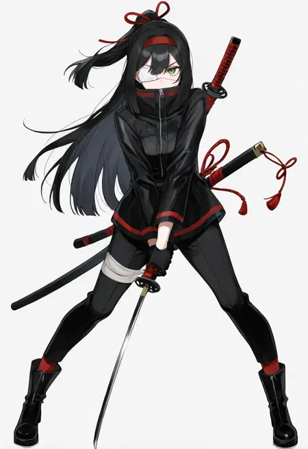 long hair, black hair, ponytail, red hairband, green eyes, medical eyepatch