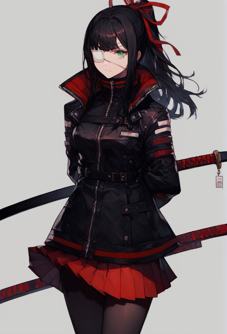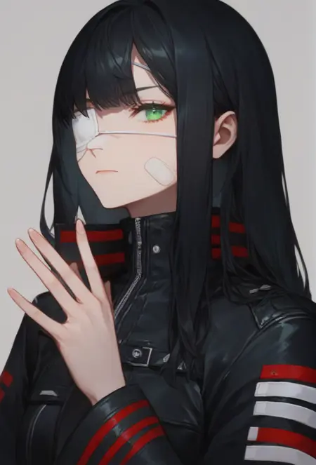 long hair, black hair, ponytail, red hairband, green eyes, medical eyepatch