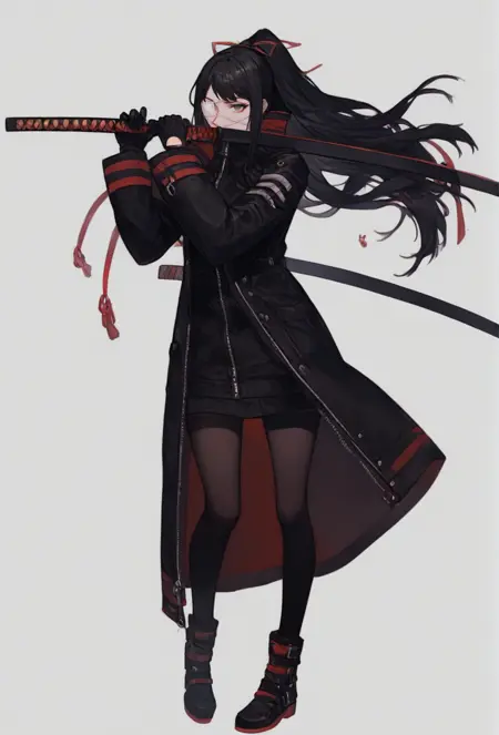 black jacket, zipper, covered mouth, black pants, black gloves, black footwear, katana, sheathed