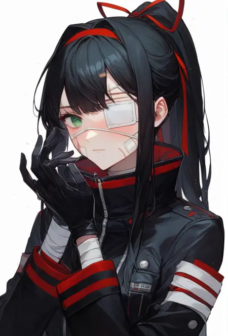 long hair, black hair, ponytail, red hairband, green eyes, medical eyepatch