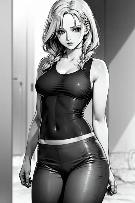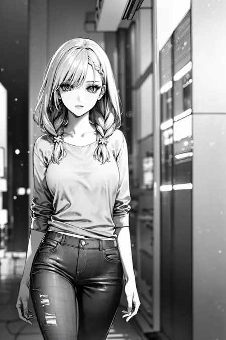 (单色),漫画风格,(手部良好),(手指良好),(长辫子),(刘海),构图完整,超精细,8K,杰作,美丽精致的脸部,(体积光照),美丽精致的眼睛,(环境光),真实阴影,(全身像:1),(1个女孩),(牛仔镜头),衬衫,裤子,直视观众,完美身材,身体比例良好:1,腿部比例良好:1,手臂比例良好:1,(GoodhandsV3)