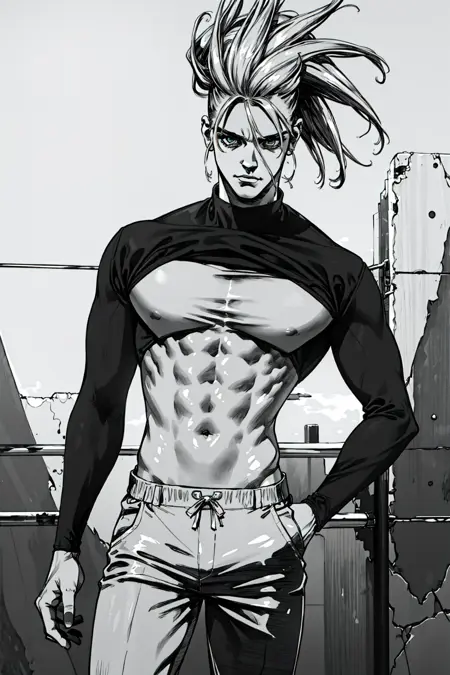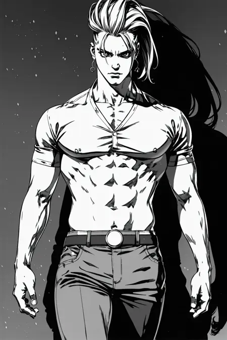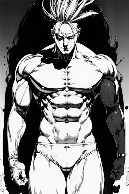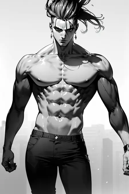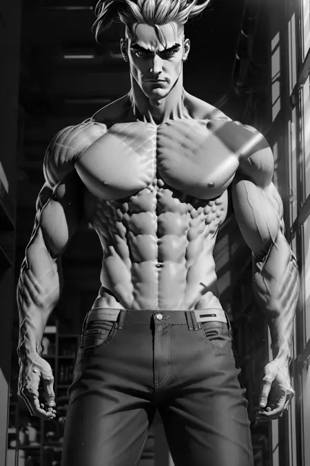 单色),(漫画风格),(漫画线稿阴影),一个身体庞大、头部较大的男人,腹肌,构图完整,超精细,8K,杰作,面部细节丰富,(体积光照),眼睛细节丰富,(环境光),真实阴影,(全身像:1),(牛仔镜头),牛仔裤,直视观众,身体比例良好:1,腿部比例良好:1,手臂比例良好:1,(GoodhandsV3)
