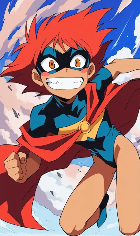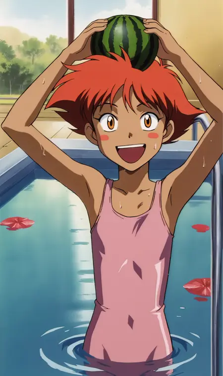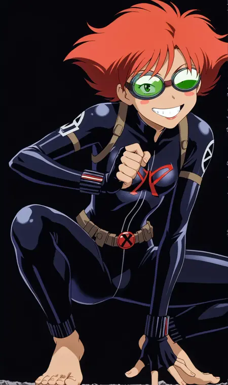 主要服装-'红色头发,橙色眼睛,腮红贴纸,宽松白衬衫,骑行短裤,护目镜,'