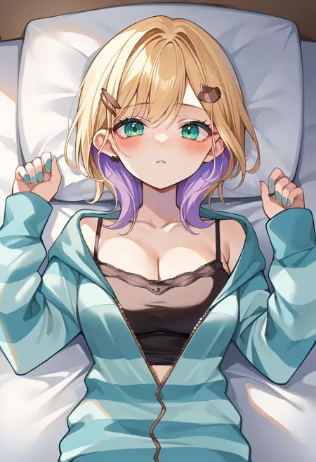 NoahSleepwear, 중간 길이 머리, 머리핀, 아쿠아 카디건, 줄무늬 카디건, 부분적으로 지퍼 열림, 검은 캐미솔, 가슴 노출, 아쿠아 반바지