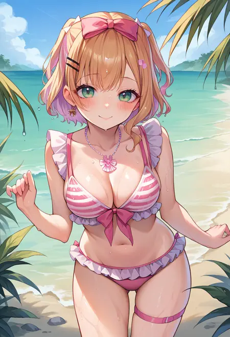 NoahSummer, 단발머리, 양쪽 위로 올린 머리, 머리핀, 머리 리본, 목걸이, 분홍색 비키니, 프릴 비키니, 줄무늬 비키니, 분홍색 허벅지 스트랩