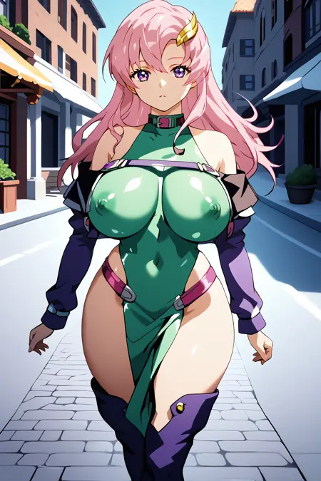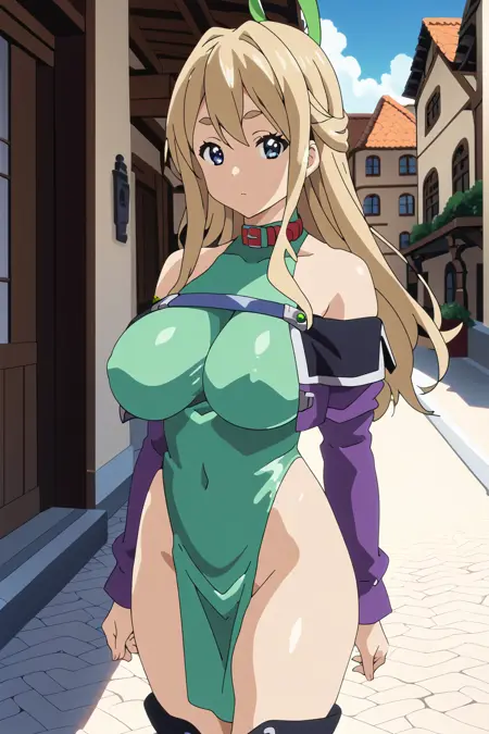 提示词:w17 \(costume\),dark purple cropped jacket,bare shoulders,pelvic curtain,impossible clothes,green dress,thigh boots,
