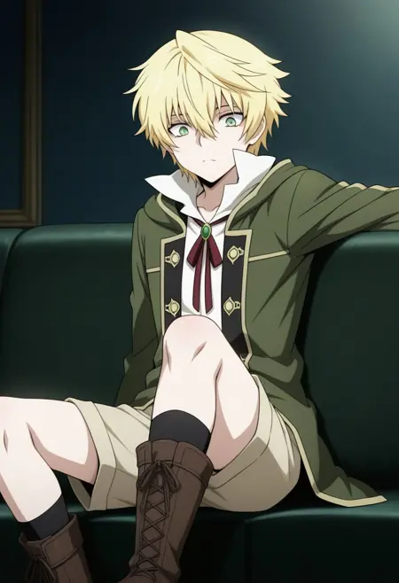 vessalius, 1boy, male focus, solo, green eyes, blonde hair, shirt, white shirt, popped collar, ribbon, neck ribbon, brooch, jacket, green jacket, shorts, brown shorts, socks, black socks, boots, brown footwear, cross-laced footwear,