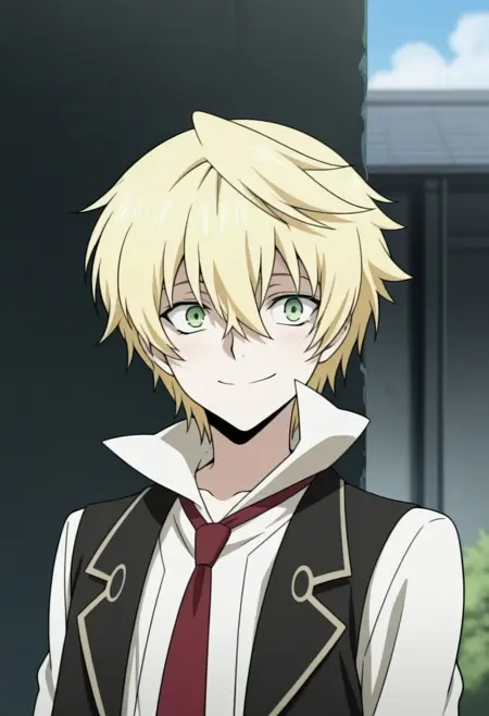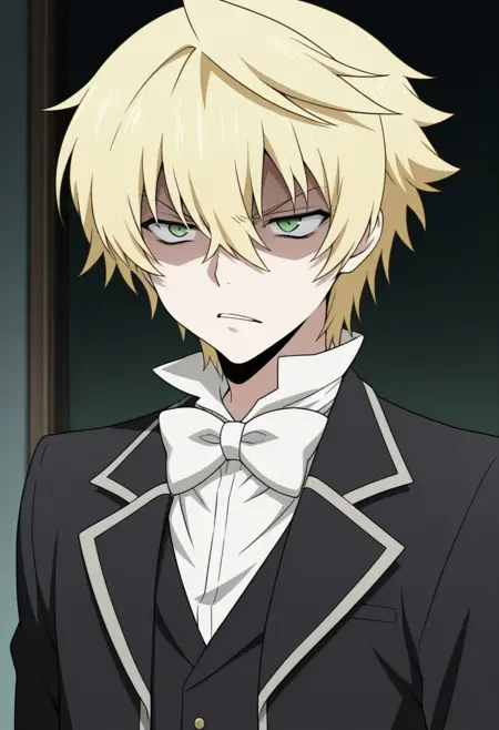 vessalius, 1boy, male focus, solo, green eyes, blonde hair, school uniform, shirt, white shirt, bowtie, white bow, vest, black vest, jacket, blazer, white jacket, open jacket, white pants,