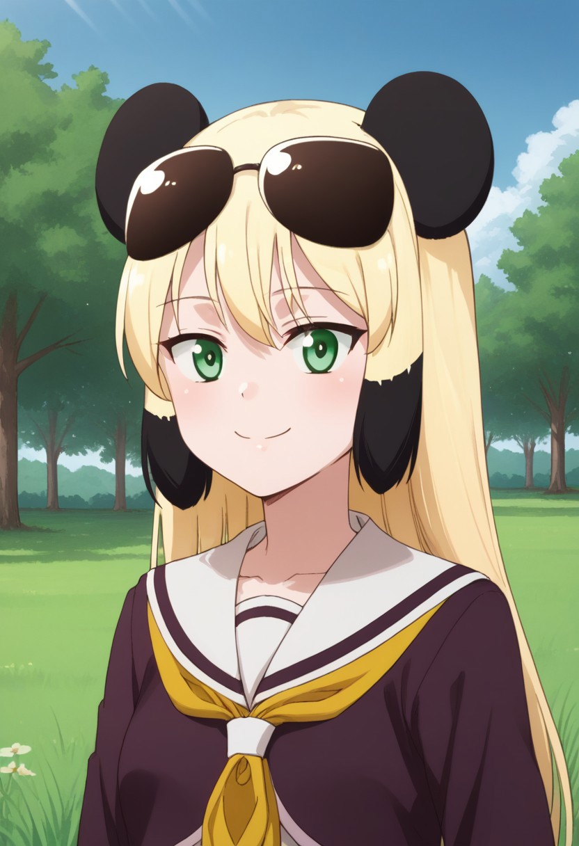 meimei, 1girl, thighhighs, skirt, green eyes, eyewear on head, long hair, blonde hair, black thighhighs, sunglasses, pleated skirt, shoes, school uniform, neckerchief, panda ears,