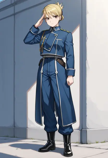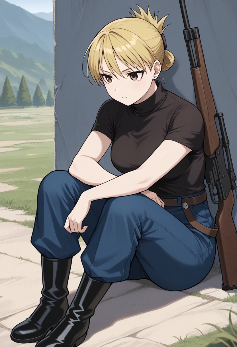 riza, 1girl, solo, brown eyes, blonde hair, folded ponytail, jewelry, earrings, uniform, military, military uniform, shirt, black shirt, jacket, blue jacket, long sleeves, aiguillette, pants, blue pants, boots, black footwear,