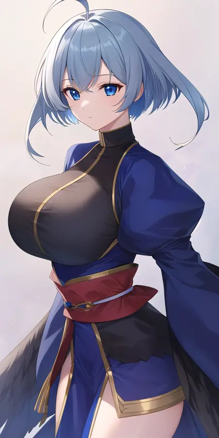 Black_china_dress_black_pelvic_curtain_white_overskirt_blue_detached_sleeves_puffy_long_sleeves_blue_sash_thighs: Kamyu og outfit