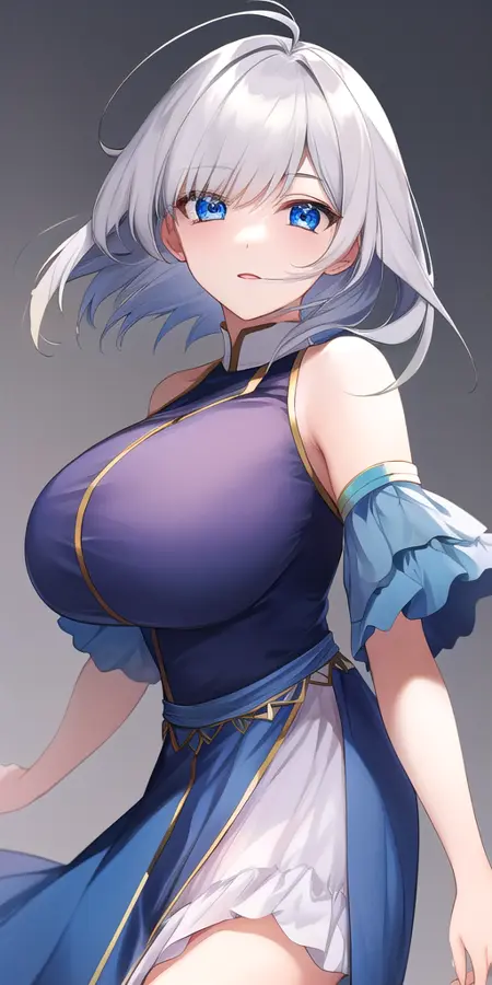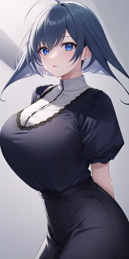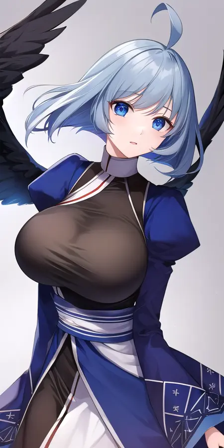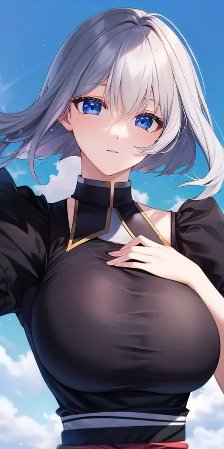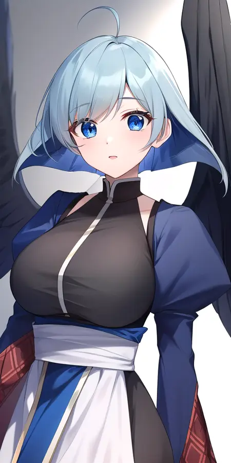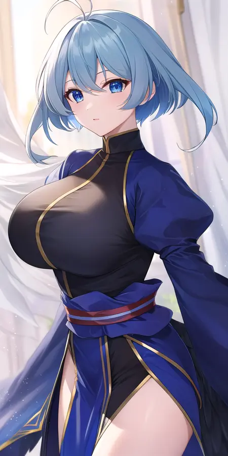 Black_china_dress_black_pelvic_curtain_white_overskirt_blue_detached_sleeves_puffy_long_sleeves_blue_sash_thighs: Kamyu og outfit