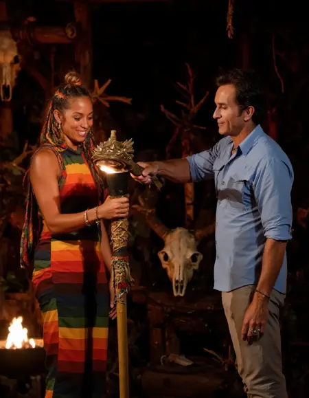 The art style of the "Survivor" Tribal Council area combines natural and rustic elements to create an atmospheric setting. It features tribal motifs, torches, and a campfire, enhancing the theme of survival. The use of wooden structures, indigenous artifacts, and dim, ambient lighting contributes to a mysterious and intense environment, reflecting the show's dramatic elimination process.