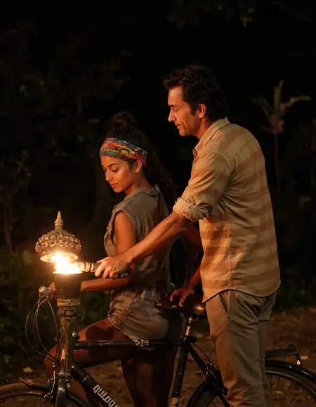 a night photo of a man jeff-probst wearing a blue button-up shirt and beige pants sitting with a thoughtful expression amidst a jungle setting, illuminated by soft firelight and a hanging red lantern, surrounded by lush green foliage and wooden structures, in the style of survivor-tribal-council