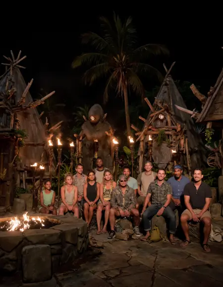 a photo of a group of people standing around a fire pit in the style of survivor-tribal-council