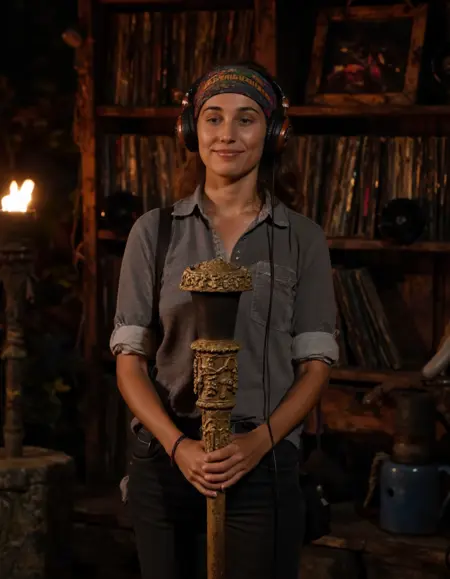 a photo of a woman in a hoodie is sitting down in the style of survivor-tribal-council
