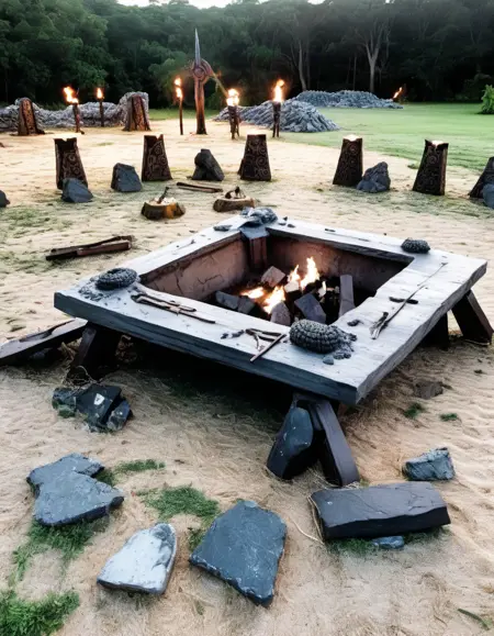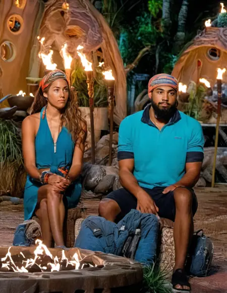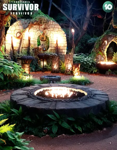 The art style of the "Survivor" Tribal Council area combines natural and rustic elements to create an atmospheric setting. It features tribal motifs, torches, and a campfire, enhancing the theme of survival. The use of wooden structures, indigenous artifacts, and dim, ambient lighting contributes to a mysterious and intense environment, reflecting the show's dramatic elimination process.