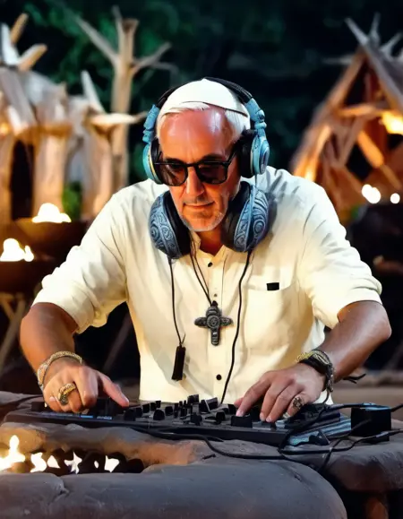 • a night photo of a man in a beige shirt and bandana, tending to a blazing fire on a stone altar, with lush green foliage and rugged rocky walls in the background, creating an atmosphere of intensity and focus in the style of survivor-tribal-council