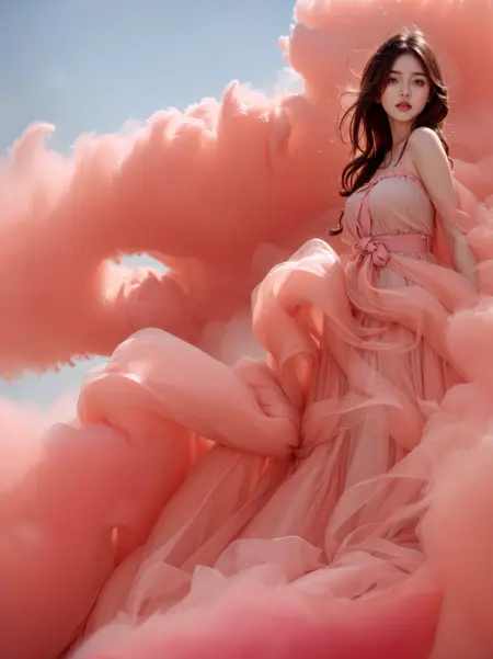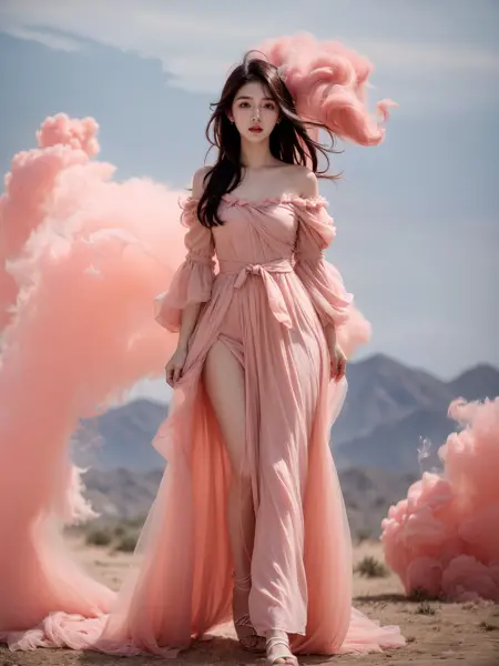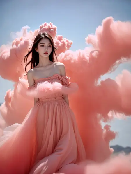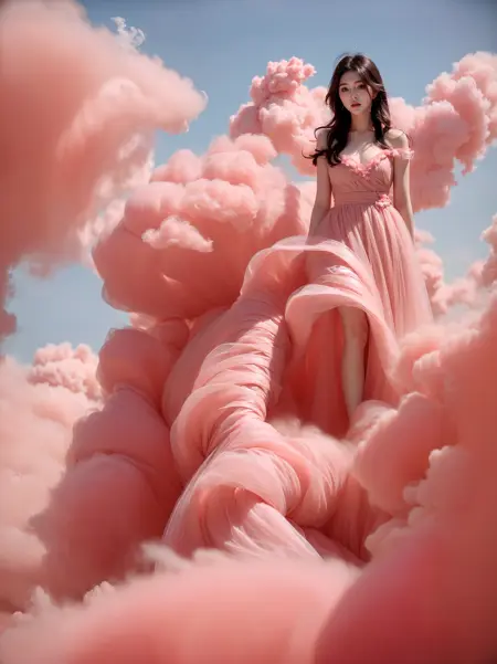 Prompt: Realistic photo, 8k, ultra realistic, 1girl, korean girl, full body, wearing dress, any pink smoke,cloud,pink dress, over viewer,<lora:JAY - Pink Dress:0.8>