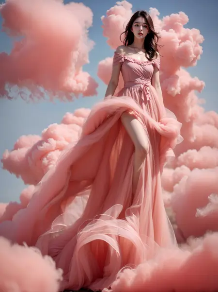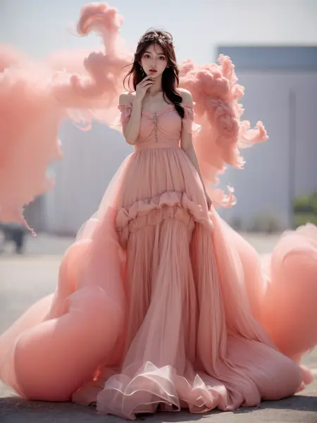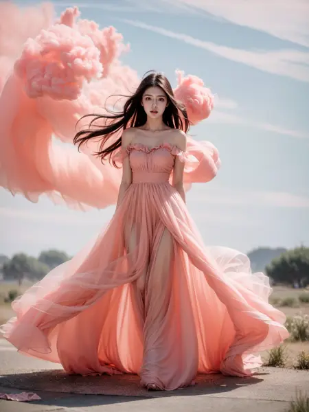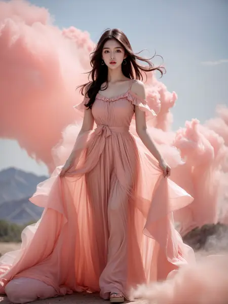 プロンプト: リアルな写真、8k、超リアル、1人の少女、韓国の女の子、全身、ドレスを着用、any pink smoke,cloud,pink dress, over viewer,<lora:JAY - Pink Dress:0.8>