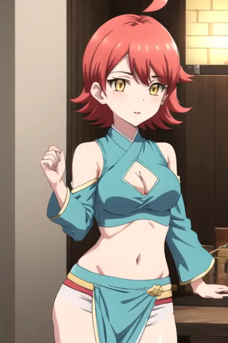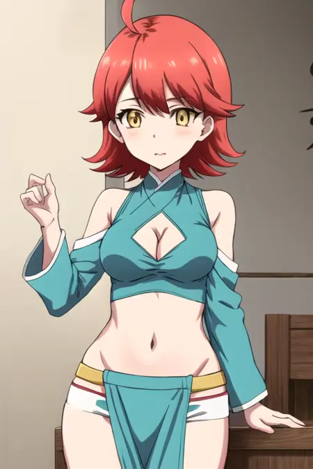 LamiaCross, 1girl, solo, short hair, medium breasts, navel, cleavage, bare shoulders, yellow eyes, ahoge, red hair, midriff, (aqua crop top), cleavage cutout, flipped hair, loincloth,