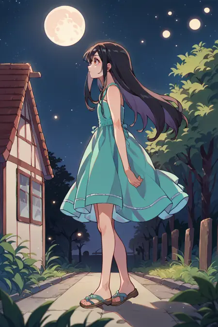 청소년 시절 플래시백 장면을 원한다면 "pastTif, 빨간 눈, 검은 머리, 긴 머리, 하늘색 선데이 드레스, 소매 없음, 샌들"을 추가하세요.