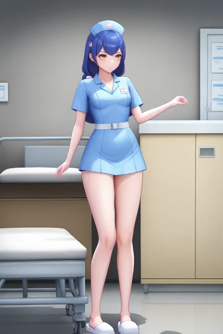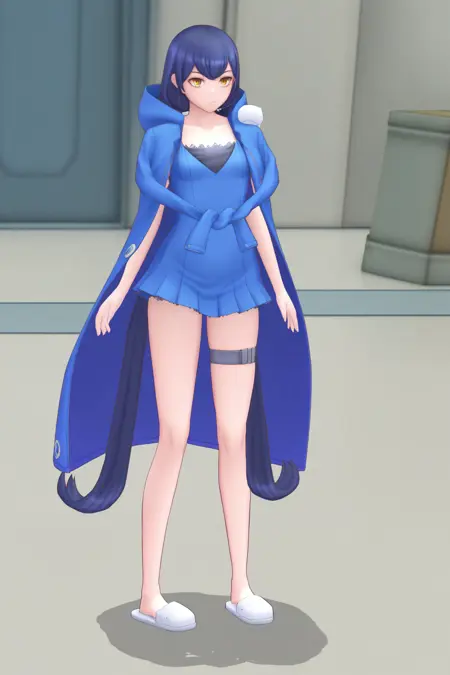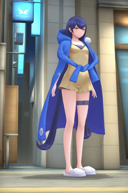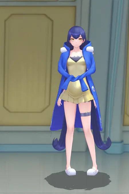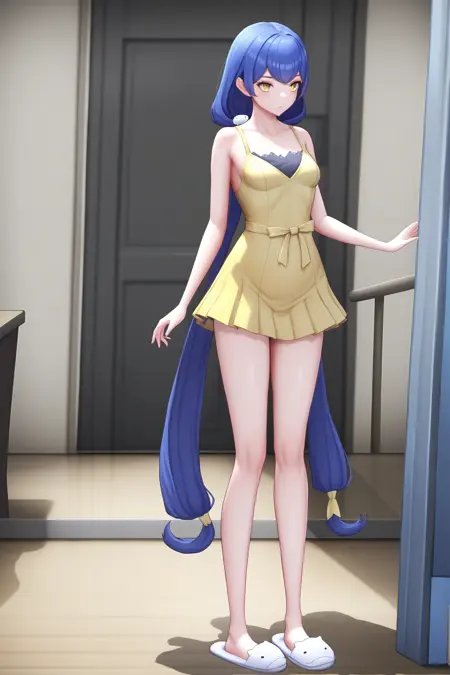 dsc-erika、黄色いドレス、スリッパ、青い髪、髪飾り