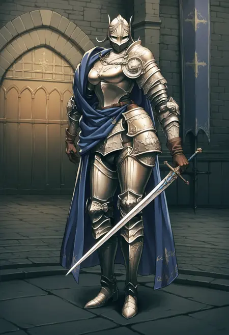 重要说明:由于我使用的几乎全部图片都显示她手持长剑,模型会倾向于让她握剑;因此,如果你不希望她持剑,请在负向提示中加入 sword, holding 以抵消此效果。她本应有一条长长的黑色马尾辫,从背后可见,但遗憾的是,在收集图像数据时,她的披风和盔甲被裁切得非常严重(拜托,FromSoft!),导致我无法很好地还原这一细节。