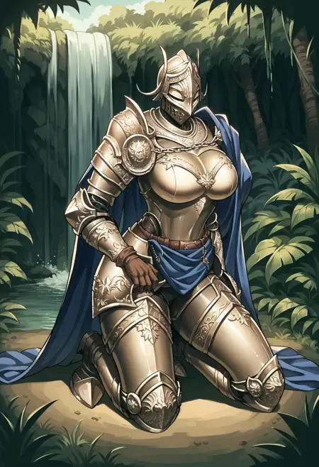 1girl, armor, full armor, shoulder armor, helmet, gauntlets, cape, knight