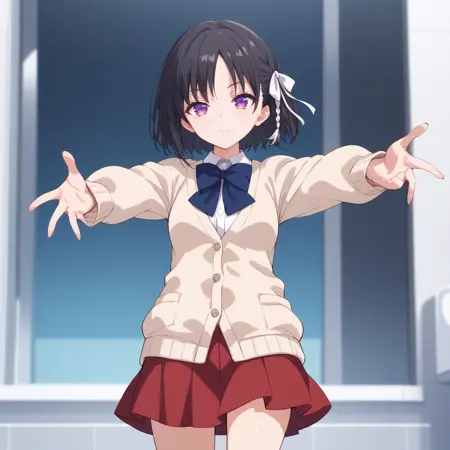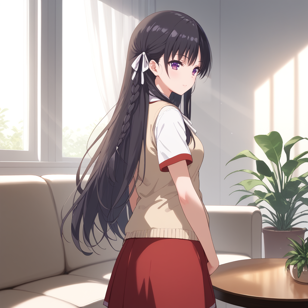 recoomend prompt: black hair, white hair ribbon, purple eyes, braid