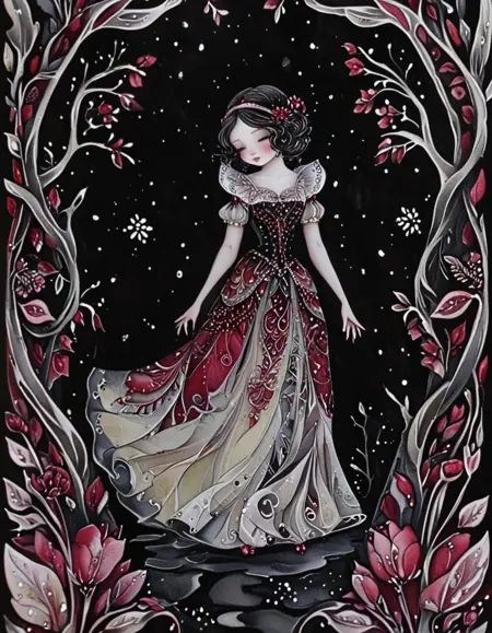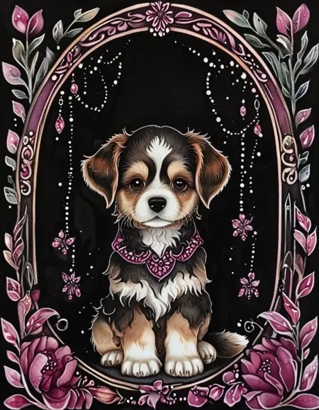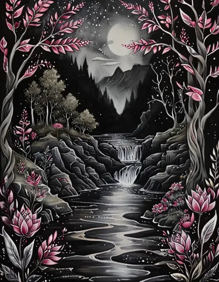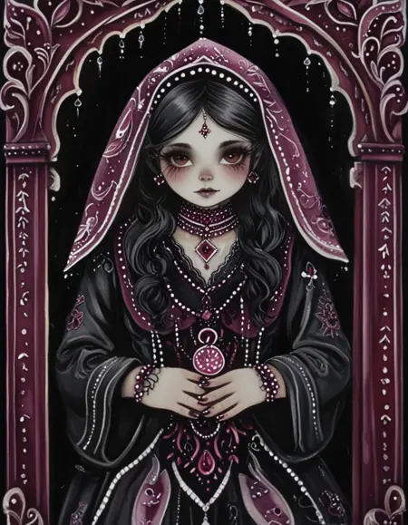 このスタイルは、主にピンク、マルベリー、ブラックのカラーパレットを特徴としています。装飾的な詳細は、ビクトリアンゴthicの審美意識を連想させます。画像にはしばしば水彩画の質感が見られます。
