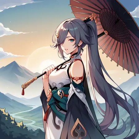 Fu_Hua, 长发, 黑发, 一缕头发遮住一只眼, fu hua, 马尾,