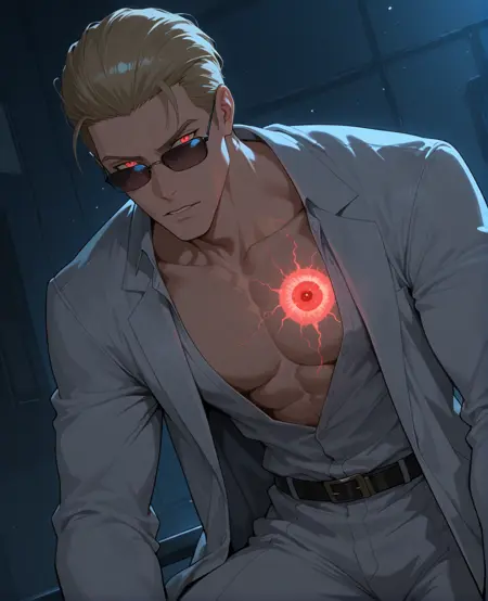 BREAK ((angular face, sharp_featured face, handsome, charming, alluring)), {red eyes, glowing|slit pupils, orange|blue} eyes, expressive eyes, perfect eyes,