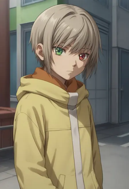 maki, 1boy, 男性焦点, 浅棕色头发, 短发, 异色瞳, 绿眼, 红眼, 帽兜, 连帽衫, 黄色连帽衫, 紫色长裤, 长裤, 雨衣, 黄色雨衣