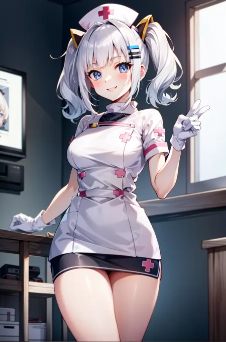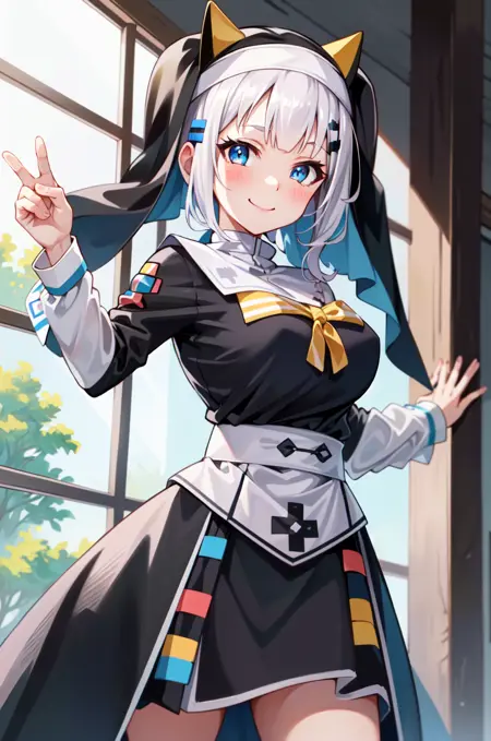 Kaguya Luna, solo, 1girl, blue eyes, pink hair, twintails, lora:KaguyaLuna:0.6, (nun uniform:1.3)