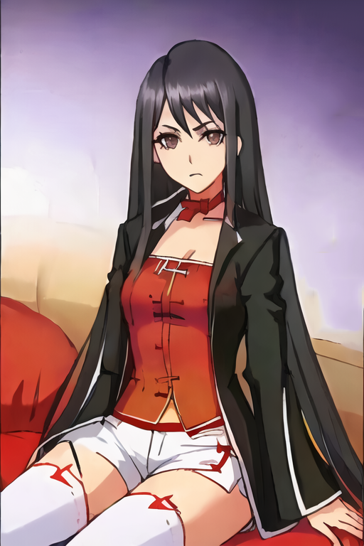 zhu zhuqing,long hair, black hair, cleavage,black jacket, red strapless dress,white shorts,thigh highs