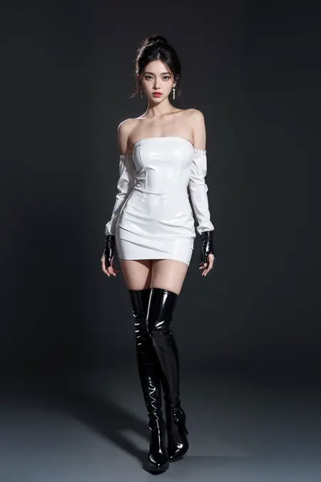 超写实,写实,摄影,杰作,最佳品质,超精细,极其详细的CG Unity 8K壁纸,1个女孩,黑色手套,看向观众,黑发,大腿袜,连衣裙,露肩,珠宝,站立,肘部手套,全身,耳环,靴子,分离袖子,高跟鞋,嘴唇,乳胶腿装,黑色鞋履,黑色连衣裙,无吊带,大腿靴,乳胶,闪亮衣物,<lora:JAY - Shiny Clothes:0,8>