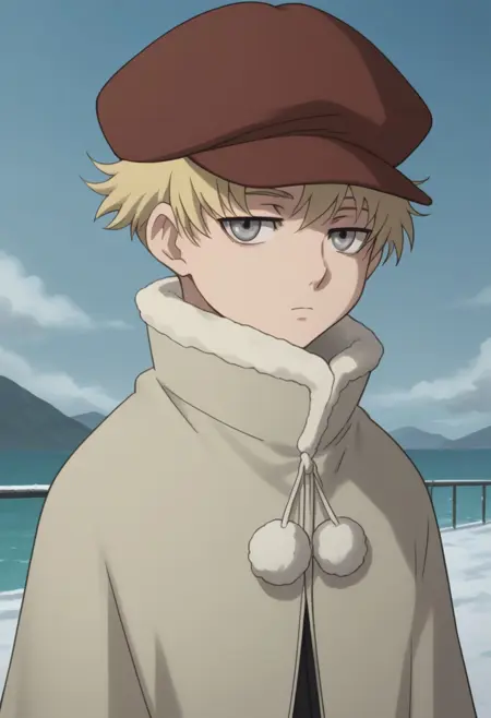 july_d, hat, blonde hair, gloves, grey eyes, 1boy, male focus, coat, short hair, long coat, shoes
