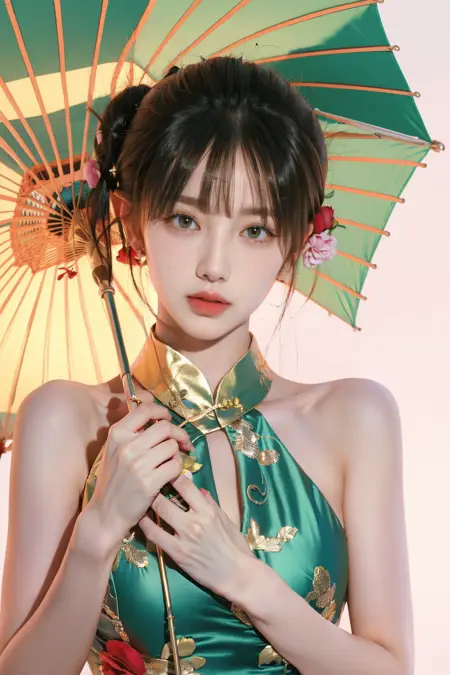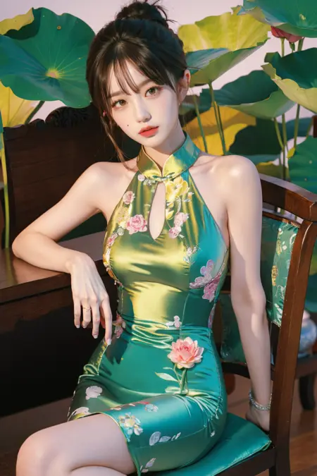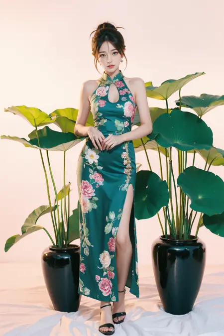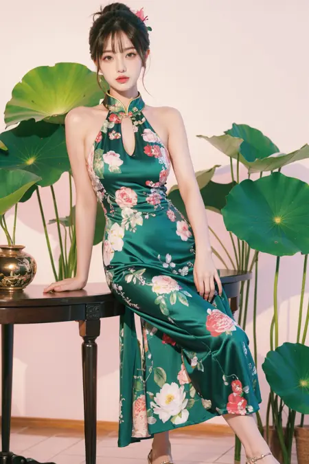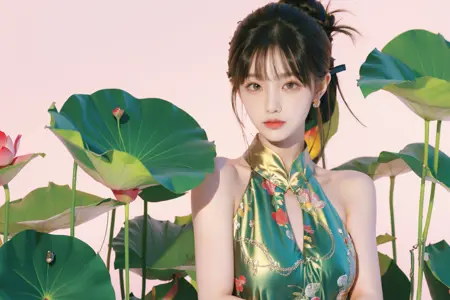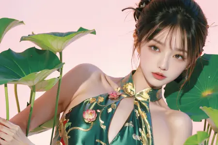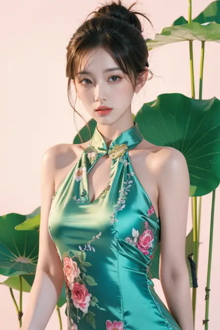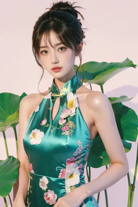 사진과 같은, 사실적인, 사진, 걸작, 최고 품질, 초세밀, 극도로 세밀한 CG 유니티 8K 배경화면,(현실성: 1.4), 1명의 소녀, 싱글, 단발, 간단한 배경, 흰색 배경, 플로럴 프린트, 보석, 갈색 머리, 검은 머리, 드레스, 어깨 노출, 입 다문 상태, 꽃, 프린트 드레스, 중국 복장, 소매 없는 드레스, 머리 뭉치, 입술, 아쿠아 드레스, 식물, 연꽃, <lora:JAY - LOTUS:0.7-1>