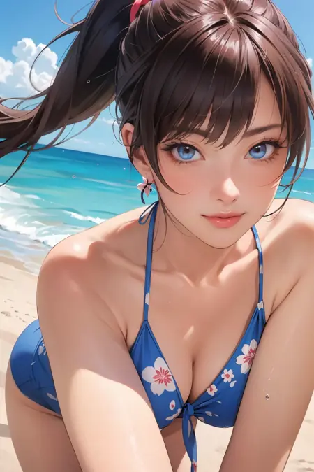 - 添加单词 "blue bikini, floral print, flower, front-tie top bottom" 可使其更接近ネモフィラ泳衣风格。