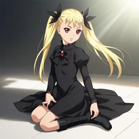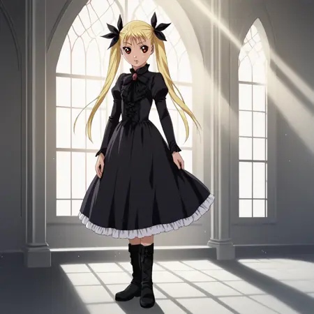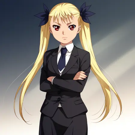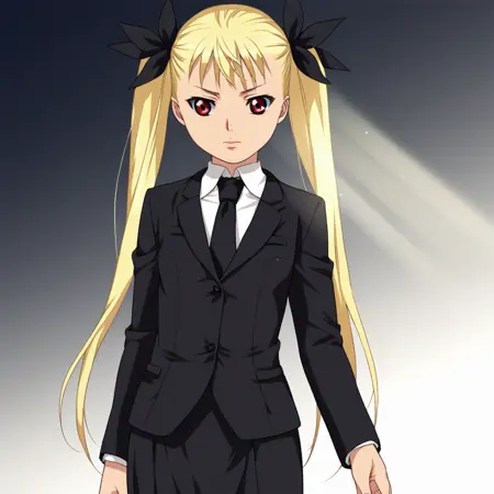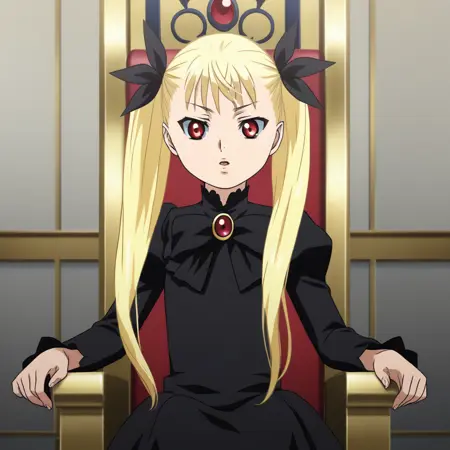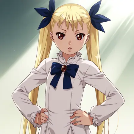 Mina Tepes, 1girl, solo, blonde hair, twintails, long hair, red eyes, hair ribbon,