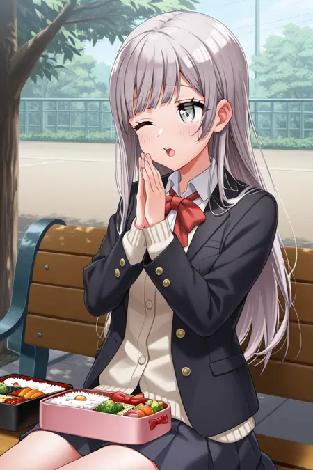 izumosaki, 1girl, solo, skirt, long hair, jacket, school uniform, grey eyes, plaid, bow, looking at viewer, blue skirt, pleated skirt, bangs, blazer, plaid skirt, shirt, white shirt, red bow, yoba school uniform