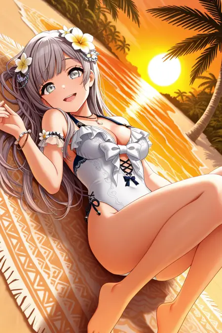 izumosaki, 1girl, gloves, long hair, solo, hat, headset, white gloves, looking at viewer, bangs, beret, sleeveless, grey eyes, thighhighs, breasts, garter straps, stgotf