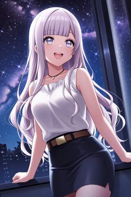 izumosaki, 1girl, solo, skirt, long hair, bangs, looking at viewer, grey eyes, belt, long sleeves, shirt, jewelry, white shirt, necklace, open clothes, blunt bangs, cardigan, cslsk