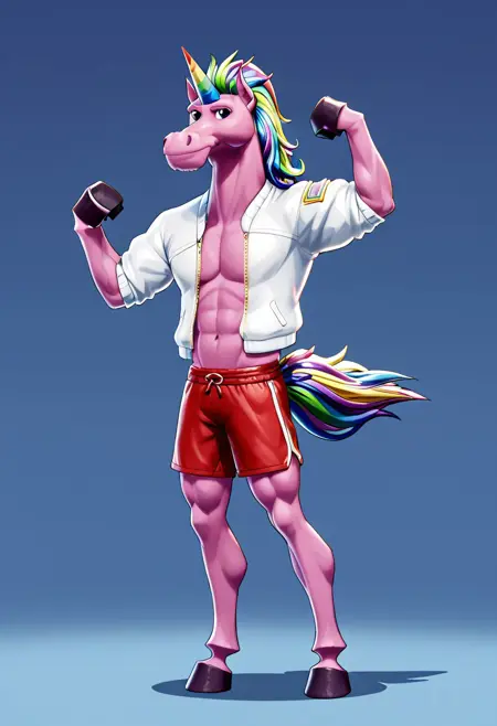 권장 태그: 분홍색 몸, 분홍색 털, 유니콘, 다색 머리카락, 다색 뿔, 보라색 발굽,