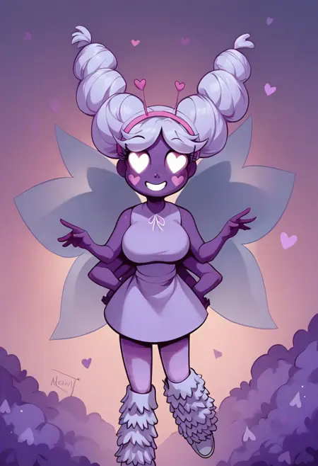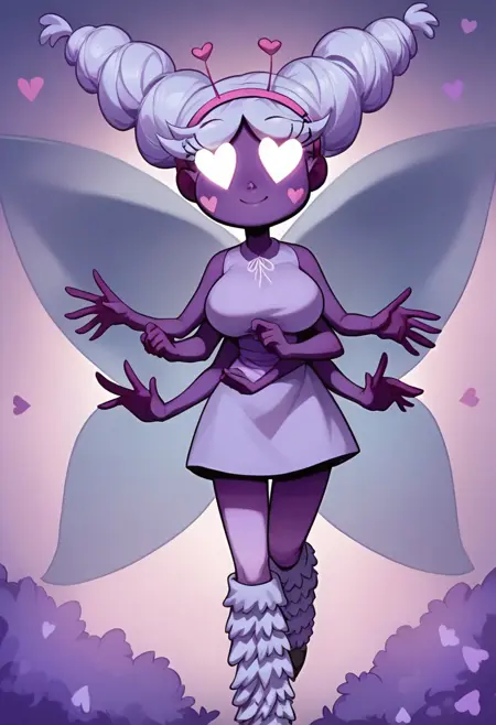 source_cartoon, mewberty_star, purple skin, pale lavender hair, up in two buns, bright heart eyes, pink heart on each cheek, six arms, large purple butterfly wings, antennae,