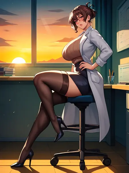 **白衣, 茶色のセーター, ペンシルスカート, 黒のハイヒール, 高めのストッキング,
